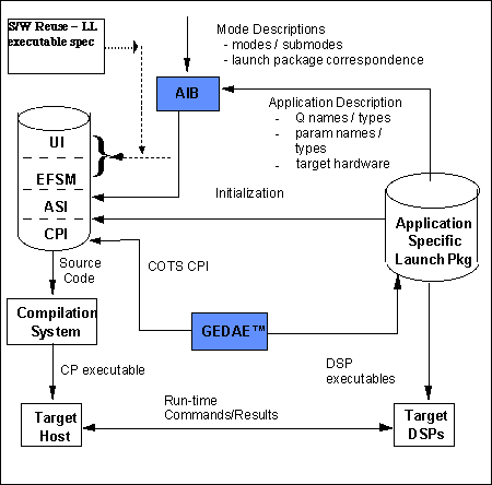Figure 2, System Software Developed with AIB and GEDAE, shows the overall development environment. The GEDAE application is used to develop and test the SAIP graph to be controlled by the CP. Under control of the GEDAE application, and totally independent of the CP, the developed graphs can be executed on the embedded Alex boards. Once a graph is completed and tested in the environment, will build an application specific launch package. The launch package contains the DSP executables as well as corollary information needed for program instantiation and initialization under CP control. For early command program testing the graph executables were targeted to the Solaris development environment, for later integration and test they were retargeted for execution on the SHARC processors on the embedded Alex boards. The AIB user provides a small text file describing the mode/launch package association and parameter set filename. The launch package corollary information is readable by AIB and provides AIB with a description of all queue and parameter names and their data types. AIB then constructs the ASI functions, which can then be integrated with EFSM and UI level source code to complete the CP.