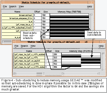 2. The sub-scheduling had always been performed out-of-place making it was necessary to keep two copies of the 96x96 complex image data. GEDAE™ was modified to use the same memory for both the input and output of the sub-schedule. This made it possible to only allocate one copy of the 96x96 image.