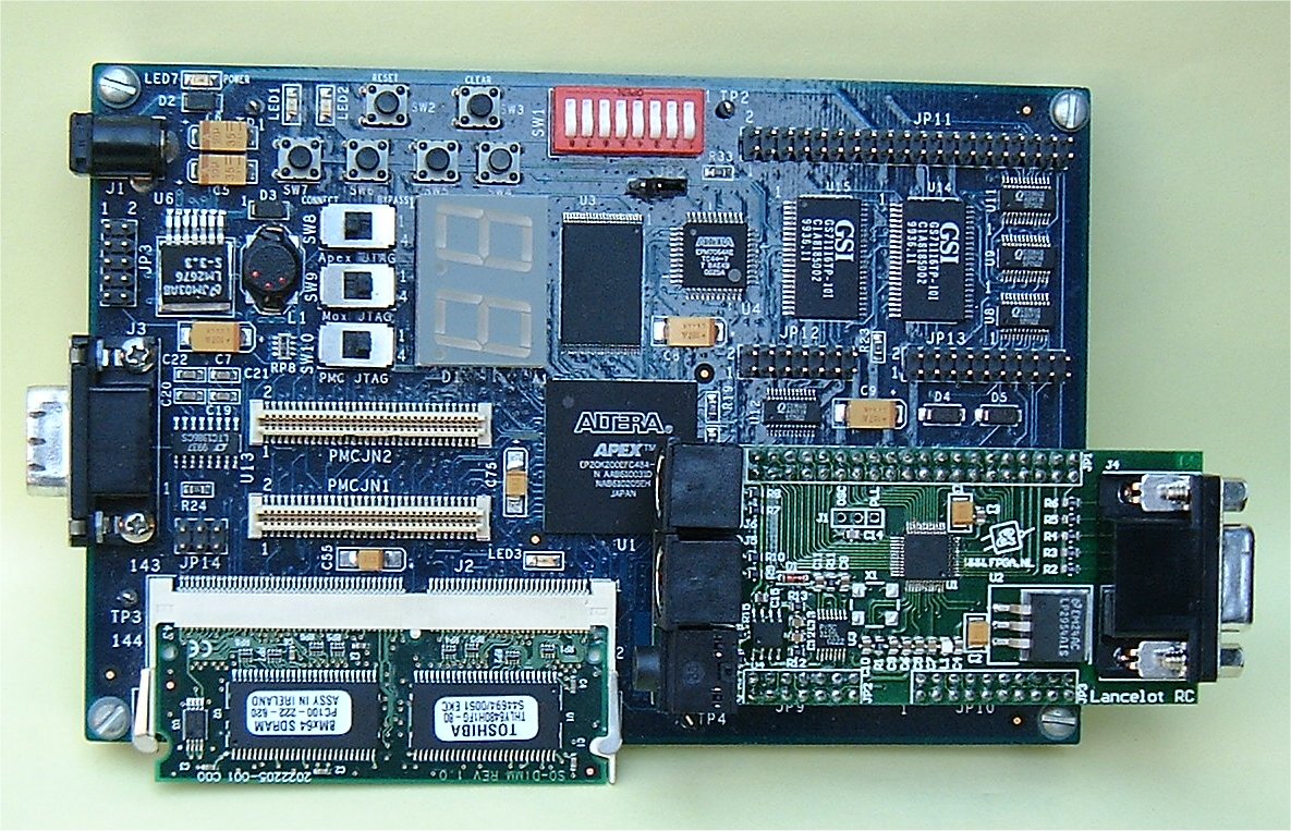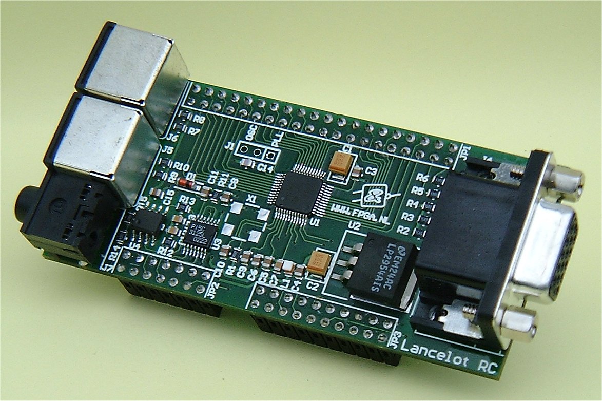The Lancelot board is a plug-in daugther card for the Altera Excalibur development boards, including the Stratix Nios and EPXA1 boards, with 24-bits video DAC, VGA connector, stereo audio jack and two PS2 connectors.