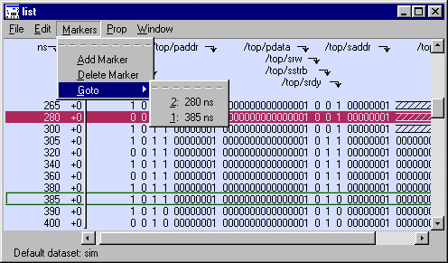 Choose a specific marked line to view by selecting Markers > Goto. The marker name (on the Goto list) corresponds to the simulation time of the selected line.