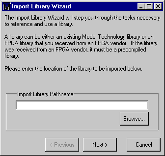 Important: The FPGA libraries you import must be pre-compiled. Most FPGA vendors supply pre-compiled libraries configured for use with ModelSim.To import an FPGA library, select Design > Import Library (Main window).