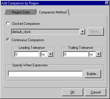 Clicking Compare > Add > Compare by Region in the Wave window opens the Add Comparison by Region window, where you can specify signals to be used in the comparison.