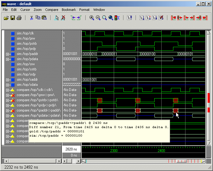 Timing differences are also indicated by red bars in the vertical and horizontal scroll bars of the waveform display, and by red difference markers on the waveforms themselves. Rectangular difference markers denote continuous differences. Diamond difference markers denote clocked differences. Placing your mouse cursor over any difference marker will initiate a popup display that provides timing details for that difference. You can toggle this popup on and off in the Wave Window Properties dialog (see "Setting Wave window display properties" ).
