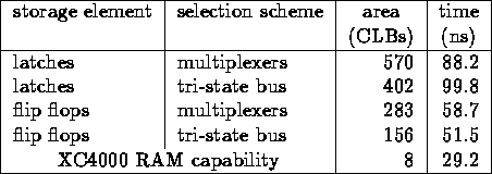 Table 6 shows how a design can be optimized by using Xilinx XC4000 features. We compare 5 different designs for a 16x16 RAM. Depending on the VHDL description, Synopsys FPGA compiler generates either flip-flops or latches as storage elements, and uses either a MUX-based signal selection scheme or tri-state buses. These implementation specifics are orthogonal, giving four possible implementations. The synthesis results for these four different architectures show how coding style in VHDL can affect resource consumption, in the example of our 16x16 scratch pad RAM yielding a 4-fold improvement.