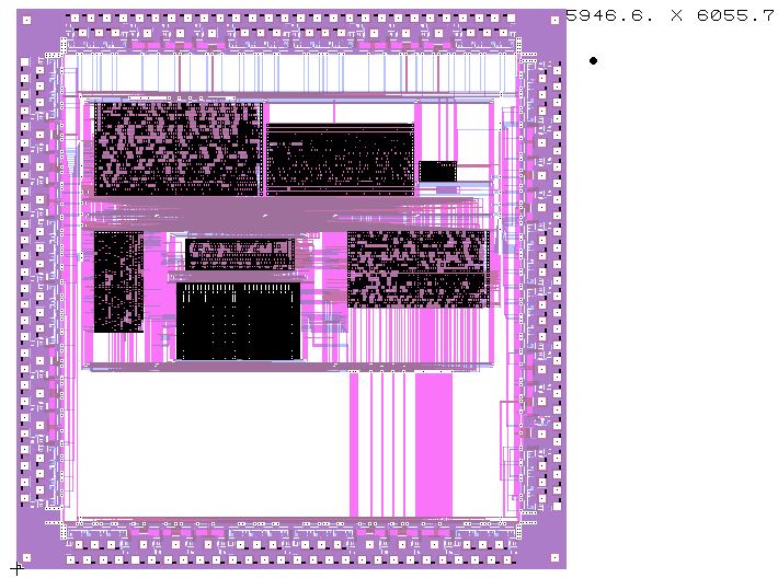 Layout of the Black Jack Dealer example with pads in scn08hp technology.