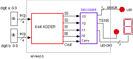 In the previous lab you designed a 4-bit adder (MY4ADD) using a full adder (MYFA) as a building block. In this lab you will be expanding the circuit to include a decoder (designed in HDL) so that you can display the results of the addition on a 7-segment display. The block diagram of the system is given in Figure 1. At the end of the lab, you will implement this adder in an actual PLD (FPGA or CPLD) and experimentally verify the performance.