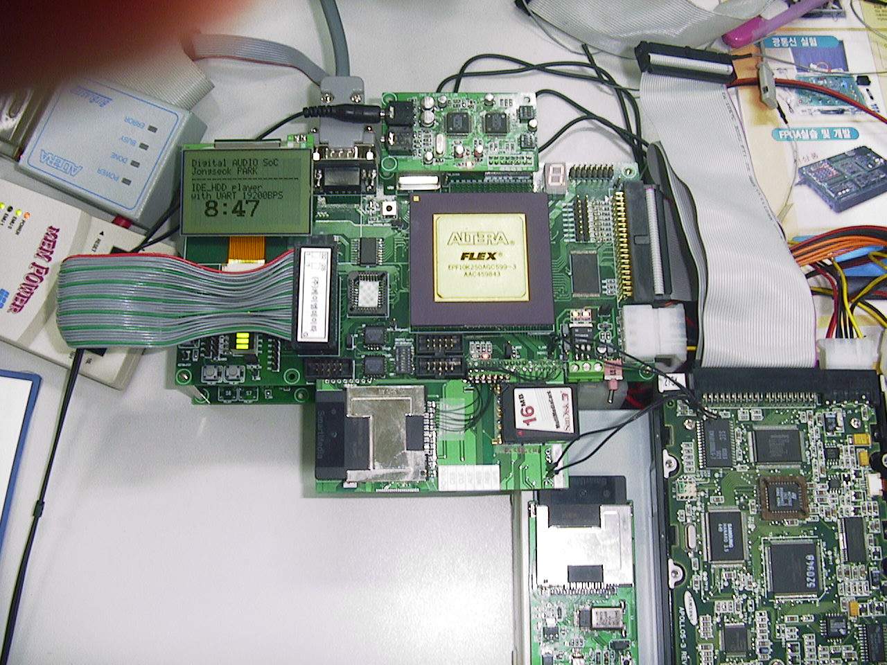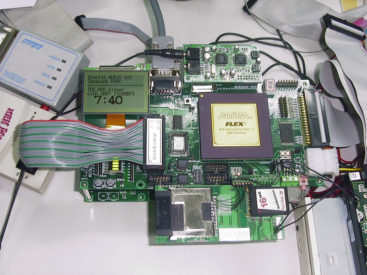 실제 설계에 있어서 i8032 core는 firmware적인 control 역할을 맡았으며 특정 기능 블럭에 해당하는 control register의 setting만으로 편하게 데이터를 주고 받을 수 있는 구조로 설계하였다. 사실 i8032 core를 수정하여 사용하는 것보다 본 논문에서 논하고자 하는 여러 가지 저장매체의 인터페이스를 이해하고 구현하는데 더 많은 시간이 필요했다. 따라서 해당되는 기능 블럭을 편리하게 사용할 수 있는 firmware 코드를 C-source로 작성하여 같이 논문에 기재하여 이 논문을 참고하는 이에게 도움을 주고자 한다. 같이 설계하려고 했던-저장매체에 빠르게 write할수 있는-USB interface에 대한 control 부분은 시간과 관련 지식의 부재로 구현하지 못했다. 대신 시중에 나와있는 USB control chip set을 사용하여 본 논문에서 설계할 controller와 별로도 USB media/read-writer를 제작하였다. 실제 system을 구현하는 부분인 FPGA 구현에 있어서 효율적인 VHDL source coding을 통하여 FPGA compile의 try-and-error를 줄일려고 노력하였다. 이 과정은 Synplify라는 FPGA compiler 툴을 사용하였는데 이 툴을 통해 warning type의 code나 functional에 상관없는 정확한 don't care처리 등을 통해 VHDL source code의 신뢰성을 높이고자 했다. 그 결과 FPGA compile에 대하여 깊은 지식이 없어도 기본적인 setting의 FPGA compile만으로도 비교적 훌륭한 결과 얻을 수 있었다. FPGA는 Altera사의 FLEX10K250이며 Altera에서 제공하는 Synopsys FPGA Express compiler와 Altera사의 MAX+plus II ver9.3을 사용하였다. 25만 게이트급을 사용하여 FPGA sell Area의 부족에서오는 signal의 invalid여부의 검증을 많이 줄일 수 있었다.