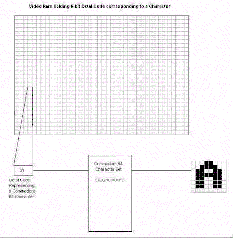 Each RAM Address holds a 6-bit octal code which maps to a ROM(tiny_char_gen_rom) defining a subset of the Commodore 64 character set. A Memory Initialization File(vidram.mif) was used to define the contents of the video RAM. The character set ROM was initialized using a file called tcgrom.mif.