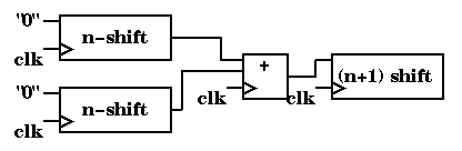 According to this definition, the shift register on the right is simply a series of dtypes where the output q of one is connected to the input d of the next. The other 2 registers are a similar arrangement using a module which we have designed previously (which?) adding the feature that if the control signal is raised, the signals on the parallel inputs will be clocked into the two registers. If that control signal is then lowered for subsequent cycles, the values will be shifted through the adder unit and the sum value is shifted into the output shift register, and (n+1) clock cycles later the operation is complete.