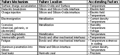 Many accelerating stresses besides elevated temperature activate various failure mechanisms. Such stresses include electric fields, current density, humidity, voltage, temperature extremes in cycling, and pressure. Table A7.1 lists several failure mechanisms, their device locations, and the factors that can be elevated to accelerate such failure mechanisms.