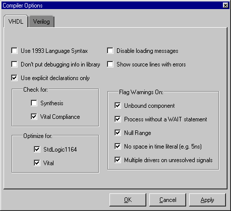 Select Options > Compile (Main window) to bring up the Compiler Options dialog box shown below. OK accepts the changes made and closes the dialog box. Apply makes the changes with the dialog box open so you can test your settings. Cancel closes the dialog box and makes no changes. The options found on each tab of the dialog box are detailed below. Changes made in the Compiler Options dialog box become the default for all future simulations.