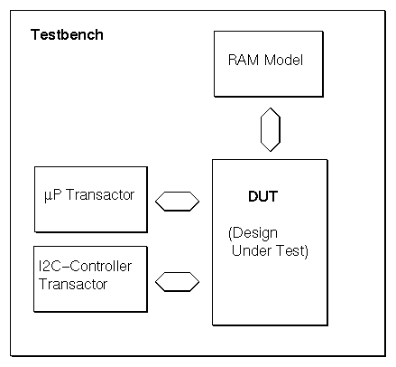 the RAM model, the I2C-Controller transactor and the design which needs to be tested (DUT).