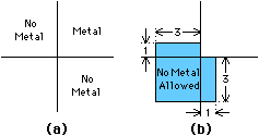 | The polygon approach to design-rule checking takes too much space and the raster approach has too narrow a view to be effective, but there are other ways to check geometric spacing. The Lyra design-rule checker [Arnold and Ousterhout] checks the corners and intersections of polygons against arbitrary spacing rules (see Fig. 5.8). Since checking is done only where the geometry changes, the scope of a corner is equivalent to a 2 × 2 window on an essential bit-map. However, the spacing rules that are applied to each corner can examine arbitrarily large areas that would exceed a fixed-window capability, even when using essential bit maps. |